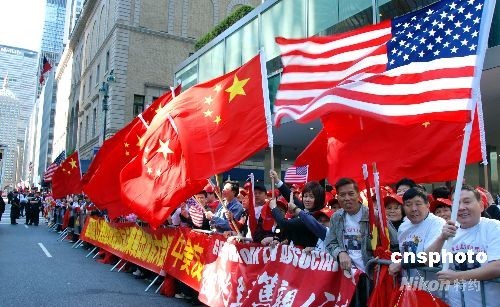中國總理溫家寶于23日上午乘專機抵達紐約,當?shù)財?shù)千華僑華人一早即聚集在他下榻的酒店附近夾道歡迎。中新社發(fā) 鄧悅 攝