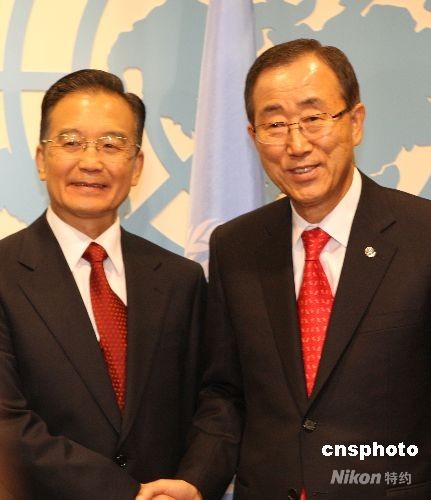 9月23日晚,中國總理溫家寶在紐約聯(lián)合國總部與聯(lián)合國秘書長(zhǎng)潘基文舉行會(huì)晤。中新社發(fā) 李靜 攝