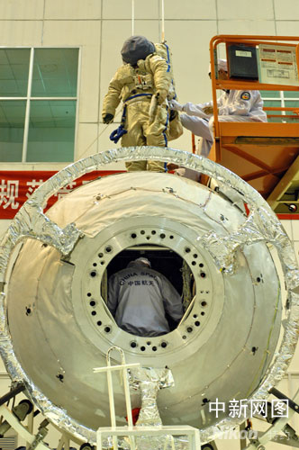 中國神舟七號載人航天飛船發(fā)射在即。圖為飛船在進(jìn)行測試。袁明月 攝