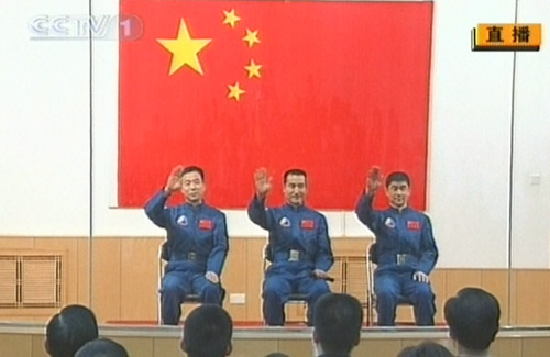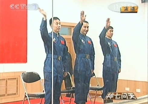 翟志剛(中)、劉伯明(右)、景海鵬組成飛行乘組執(zhí)行“神舟七號(hào)”載人航天飛行任務(wù)。(央視截圖)