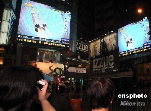 九月二十五日晚,中國載人太空船“神舟七號”在中國酒泉衛(wèi)星發(fā)射中心順利升空。圖為“神舟七號”升空相關新聞片段在香港銅鑼灣鬧市播放,吸引市民駐足觀看。中新社發(fā) 鄧慶樂 攝
