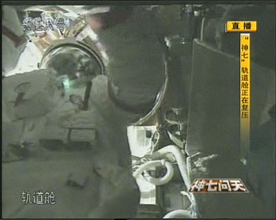 9月27日,“神七”航天員翟志剛完成出艙活動(dòng)后,回到軌道艙并對軌道艙進(jìn)行艙門檢漏后復(fù)壓。