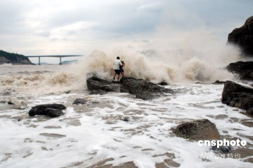 9月28日,受超強臺風(fēng)“薔薇”影響,浙江溫州市洞頭島海域已是波濤洶涌,海礁上掀起的巨浪高達10多米。下午2時許,一對外地父女在海邊游玩時不慎被突漲的潮水困在礁石上,隨時可能被海浪吞噬。正在海邊巡邏的洞頭邊防大隊官兵發(fā)現(xiàn)險情后,迅速展開緊急營救,成功將父女從海浪中安全救上岸。中新社發(fā) 吳水斌 攝