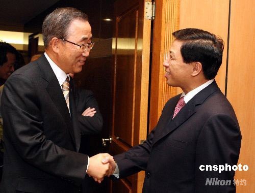中國(guó)常駐聯(lián)合國(guó)代表團(tuán)29日晚舉辦中國(guó)國(guó)慶59周年招待會(huì),聯(lián)合國(guó)秘書長(zhǎng)潘基文出席。圖為中國(guó)新任常駐聯(lián)合國(guó)代表張業(yè)遂歡迎潘基文出席招待會(huì)。中新社發(fā) 李靜 攝