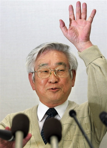 圖為日本科學(xué)家益川敏英(Toshihide Maskawa)獲獎(jiǎng)后在東京招待會(huì)上向大家致意。