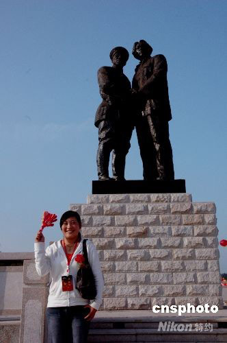 十月七日,一尊重五點四噸,高五點八米朱德和毛澤東會師的大型銅像,在井岡山龍市朱毛會師廣場揭幕,銅像吸引了眾多的中外游客觀賞和拍攝。中新社發(fā) 段長征 攝