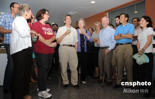 當(dāng)?shù)貢r(shí)間10月8日下午,美國(guó)加州大學(xué)圣地亞哥分校醫(yī)學(xué)院和藥理學(xué)系,為剛剛榮獲諾貝爾化學(xué)獎(jiǎng)的華裔科學(xué)家錢永健舉行慶祝會(huì)。錢永健和夫人溫迪,以及他的同事、學(xué)生等近百人出席。中新社發(fā) 張煒 攝