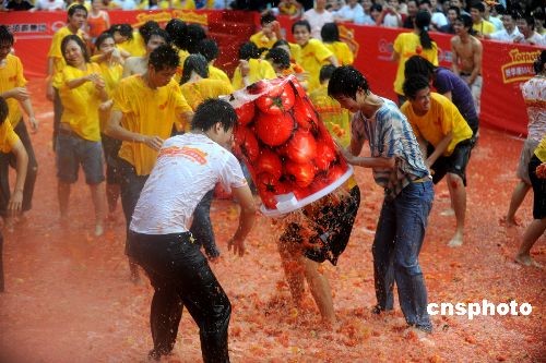 10月19日,一場番茄大戰(zhàn)在廣東省東莞華南MALL狂熱上演。為避免砸傷事故,15噸西紅柿經(jīng)過專門的軟化。此次狂歡活動吸引了上萬人觀看。游客分批進(jìn)入番茄池狂砸,根本不管比賽規(guī)則,不要分?jǐn)?shù),只要開心。中新社發(fā) 許康平 攝