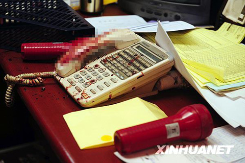 韓國(guó)首都首爾發(fā)生縱火行兇事件的旅館,管理辦公室內(nèi)的電話(huà)上沾滿(mǎn)了被害人的鮮血。新華社/紐西斯通訊社