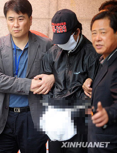 10月23日上午,韓國警方與20日在首爾某旅館制造縱火行兇事件的嫌犯鄭某(戴口罩者)到案發(fā)現(xiàn)場取證。新華社/韓國紐西斯通訊社