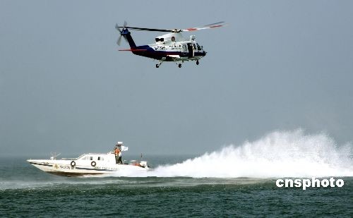 圖為直升機(jī)和海上救助船舶進(jìn)行救人演練。中新社發(fā) 王東明 攝