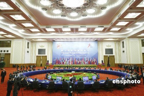 第七屆亞歐首腦會(huì)議在北京人民大會(huì)堂舉行第一次全體會(huì)議,議題是討論國(guó)際經(jīng)濟(jì)金融形勢(shì)問題。中新社發(fā) 盛佳鵬 攝