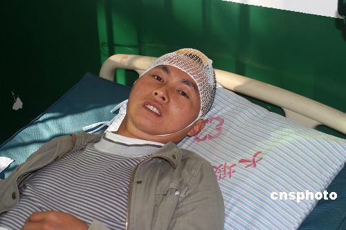 江西省宜春市銅鼓縣大塅鎮(zhèn)村民與當(dāng)?shù)鼐G海木業(yè)有限公司日前發(fā)生的一起沖突事件目前已平息。該事件造成十幾名村民受傷,三名警員受傷,除一名被擊中胸部的警察傷勢(shì)嚴(yán)重仍在全力救治外,其余傷員病情穩(wěn)定。圖為二十七日一名頭部受傷的村民正在當(dāng)?shù)蒯t(yī)院接受治療。中新社發(fā) 艾永全 攝