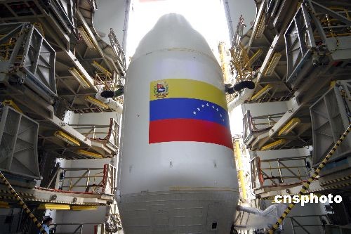 發(fā)射前位于運(yùn)載火箭頂部的衛(wèi)星整流罩外印有委內(nèi)瑞拉國旗。中新社發(fā) 尹濤 攝