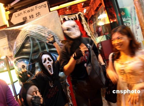 十月三十一日晚,香港中區(qū)蘭桂坊一帶人聲鼎沸,大批市民、游客在擁擠的酒吧街激情狂歡,歡度一年一度的西方“萬圣節(jié)”。中新社發(fā) 洪少葵 攝