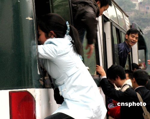 重慶主城區(qū)出租車罷運事件11月4日上午仍在持續(xù),但從重慶市出租汽車協(xié)會了解到,截止4日下午16點30分,重慶主城區(qū)共有4000多輛出租車上路營運,占全市主城區(qū)出租車數(shù)量的一半,持續(xù)到4日上午的罷運事件出現(xiàn)良好轉(zhuǎn)機,但仍嚴重影響市民出行,在南坪區(qū)出現(xiàn)了部分市民為了趕車回家攀爬公交車的情景。中新社發(fā) 許康平 攝