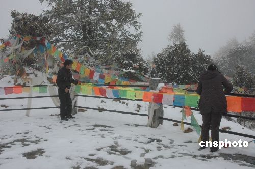 深秋季節(jié),四川甘孜藏族自治州高海拔地區(qū)普降大雪。圖為被譽(yù)為“中國(guó)最后的香格里拉”——四川稻城縣內(nèi),當(dāng)?shù)夭孛裾谘┑刂袙忑堖_(dá)祈禱吉祥。中新社發(fā) 肖龍聯(lián) 攝