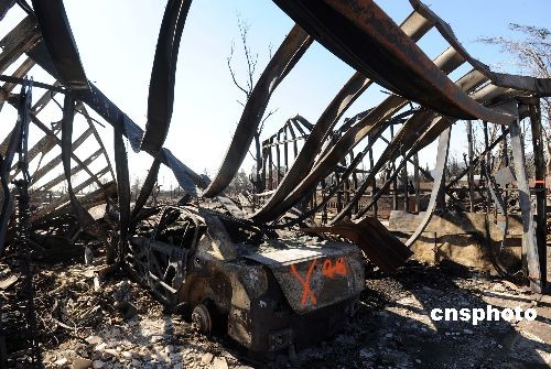 十一月十八日,洛杉磯北部希爾瑪市的一個居民區(qū)在大火中幾乎被焚毀,整個社區(qū)六百零八間住宅中的四百八十間蕩然無存。這是四十多年來,洛杉磯遭受的房屋損失最嚴重的火災(zāi)。中新社發(fā) 張煒 攝