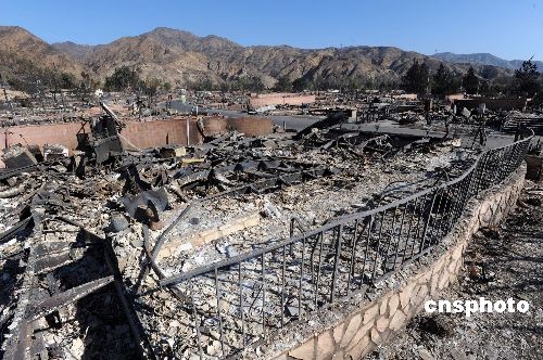 十一月十八日,洛杉磯北部希爾瑪市的一個居民區(qū)在大火中幾乎被焚毀,整個社區(qū)六百零八間住宅中的四百八十間蕩然無存。中新社發(fā) 張煒 攝
