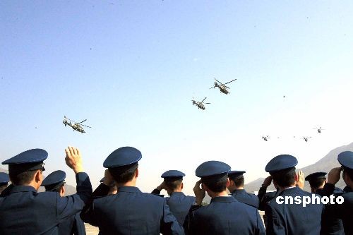 上午十時二十分,空軍六架直升機從石崗機場起飛,離開香港 。中新社發(fā) 張勤 攝