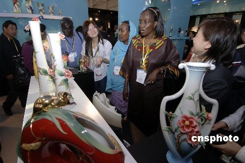 十一月二十七日上午,非洲客人在廈門文化藝術(shù)中心臺灣“法藍(lán)瓷”工藝品展館里流連忘返。中新社發(fā) 王東明 攝