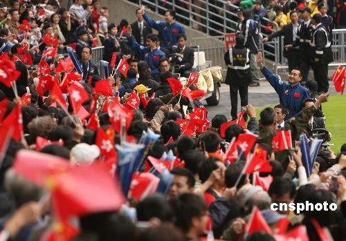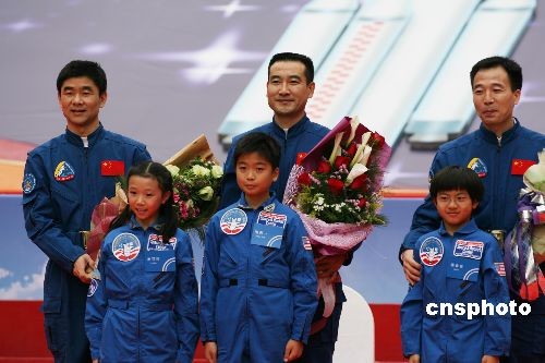 圖為三位航天員接受小“航天員”獻(xiàn)花。