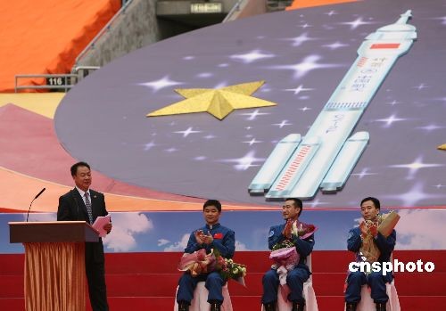 圖為代表團(tuán)團(tuán)長(zhǎng)張建啟與神舟七號(hào)航天員翟志剛、劉伯明和景海鵬在主席臺(tái)上。中新社發(fā) 武仲林 攝