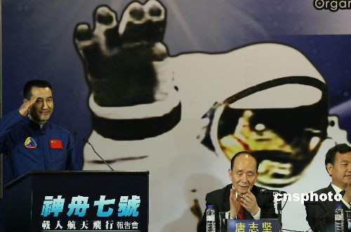 十二月八日,“神舟七號(hào)”載人航天飛行代表團(tuán)在澳門(mén)舉行報(bào)告會(huì)。