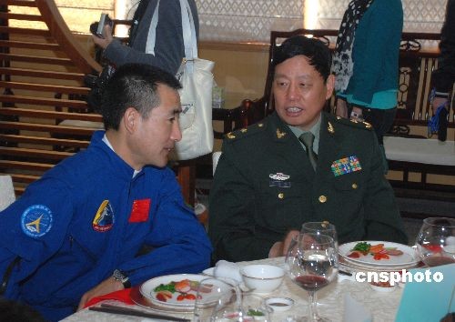 圖為駐澳門部隊(duì)司令員王玉仁在歡迎午宴上與航天英雄翟志剛交談。中新社發(fā) 畢永光 攝