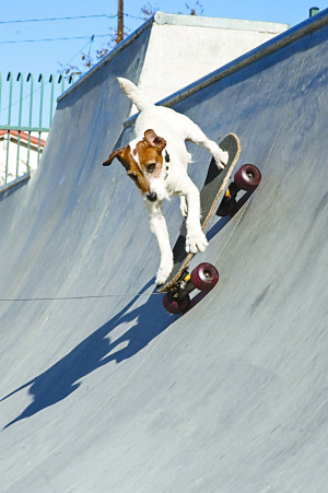 6歲的杰克拉塞爾犬“Auggie”和1歲的美國斗牛犬“Popeye”都是滑板高手。近日,它們在主人Omar Muller的帶領(lǐng)下在美國洛杉磯海灘大秀滑板技藝。
