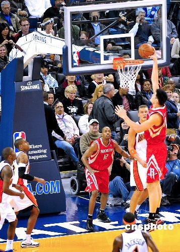 當地時間12月12日晚,休斯頓火箭隊與金州勇士隊在加州奧克蘭主場甲骨文體育館進行一場比賽。姚明雖患感冒但仍拿下19分14個籃板,阿泰斯特因為右腳踝有傷休戰(zhàn),1號球星麥格雷迪復出首發(fā)并表現搶眼,最終火箭以119-108輕松戰(zhàn)勝對手取得兩連勝,時隔一周后再次大勝勇士。目前火箭總戰(zhàn)績達到15勝8負,勇士7勝16負。圖為姚明上籃。中新社發(fā) 陳鋼 攝
