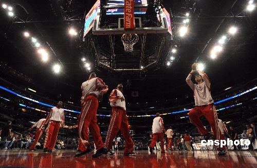 圖為火箭隊賽前熱身。中新社發(fā) 張煒 攝