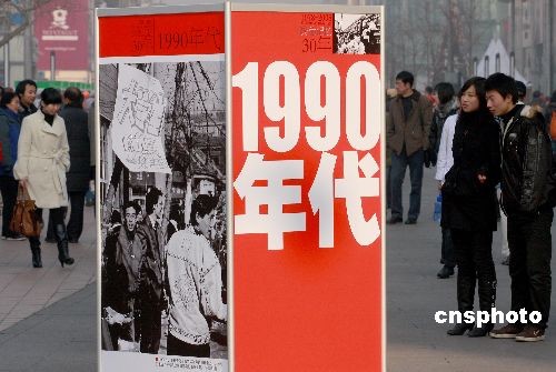 12月16日,紀念改革開放30周年全國攝影大展在北京王府井大街開幕。本次展覽由“民生記憶30年”、“城鎮(zhèn)記憶30年”、“家庭記憶30年”3部分組成,共展出攝影作品近800幅。其中“民生記憶30年”部分將中國自1978年以來的30年變革脈絡(luò),用百姓的視角、平凡的瞬間加以詮釋與展現(xiàn),還原質(zhì)樸的生活。中新社發(fā) 鄭雄增 攝