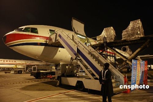 12月17日凌晨0點(diǎn)10分,中國(guó)貨運(yùn)航空有限公司的航班號(hào)為ck261次包機(jī)從上海浦東機(jī)場(chǎng)起飛,預(yù)計(jì)將于1點(diǎn)40分抵達(dá)臺(tái)北桃園機(jī)場(chǎng),這是上海地區(qū)首架直航抵臺(tái)的貨運(yùn)包機(jī)。圖為ck261次包機(jī)在浦東機(jī)場(chǎng)裝運(yùn)貨物。中新社發(fā) 湯彥俊 攝