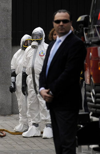 圖為西班牙馬德里美國(guó)使館外的安全人員。