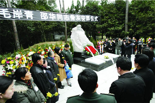 經(jīng)中央批準(zhǔn),毛岸青、邵華同志骨灰昨日(21日)下午由北京遷葬楊開慧烈士陵園,永遠(yuǎn)地留在了媽媽楊開慧烈士的身邊!坝H愛的爸爸媽媽,今天我和妻子劉濱以及你們的孫子?xùn)|東,終于把你們送到了開慧奶奶的身邊,實現(xiàn)了你們的遺愿!”在骨灰安葬儀式上,毛岸青、邵華的兒子毛新宇動情地說。省委書記、省人大常委會主任張春賢,省委副書記、省長周強(qiáng)向毛岸青、邵華同志敬獻(xiàn)了花籃。