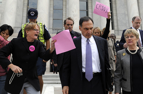 信貸緊縮雷曼破產(chǎn),首席執(zhí)行官 Richard S. Fuld 無奈面對抗議人。