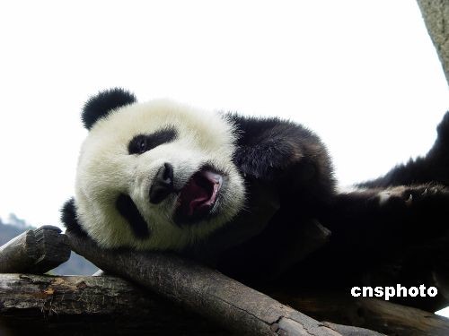 2005年4月19日拍攝的8個(gè)月的“圓圓”,趴在樹枝上賴床還鬧脾氣。中新社發(fā) 何永果 李偉 攝