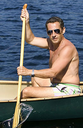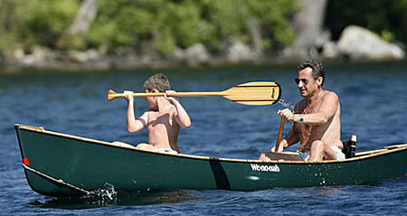 2007年8月4日,法國總統(tǒng)薩科齊與兒子在美國新罕布什爾州沃爾夫伯勒的溫尼珀索基湖上劃獨木舟,享受悠閑的假期。