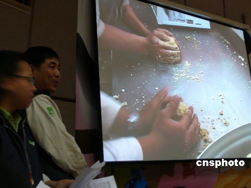 大陸贈(zèng)臺(tái)一對(duì)大熊貓“團(tuán)團(tuán)”和“圓圓”二十三日晚間抵達(dá)臺(tái)北,住進(jìn)臺(tái)北市立動(dòng)物園的新光特展館。圖為動(dòng)物園發(fā)言人金仕謙(左二)介紹大熊貓的精制飼料——窩窩頭的做法。 中新社發(fā) 路梅 攝