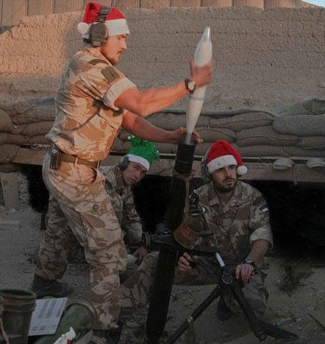 圣誕帽、迫擊炮兩者結合令場面顯得非常怪異。