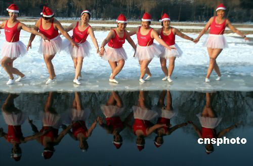 在中國吉林,圣誕老人雪地里跳天鵝湖。