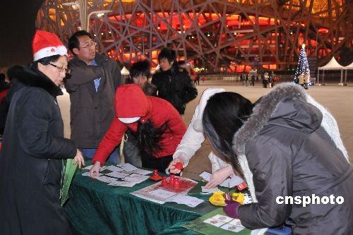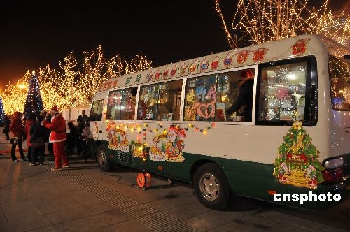 12月24日晚,一輛“圣誕郵車”來(lái)到北京奧林匹克公園中心區(qū)景觀大道一側(cè),在平安夜為廣大游客服務(wù),給親朋好友送上美好的祝福。中新社發(fā) 馮軍 攝