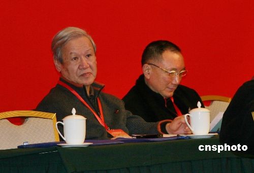 著名導(dǎo)演謝飛(左)、中影集團(tuán)董事長(zhǎng)韓三平在主席臺(tái)就坐。 中新社發(fā) 黃寧 攝
