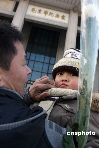 12月26日毛澤東115周年誕辰日清晨,一名四川地震災(zāi)區(qū)的三歲男童與父親到位于北京天安門廣場(chǎng)的“毛主席紀(jì)念堂”敬獻(xiàn)白菊鮮花,深切懷念偉大領(lǐng)袖毛主席。