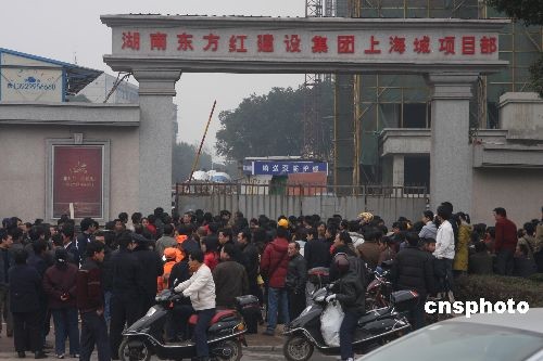 許多人在長沙市井灣子韶山南路634號湖南東方紅建設(shè)集團上海城19棟項目部發(fā)生建筑施工升降機掛籃墜落事故現(xiàn)場圍觀。中新社發(fā) 郭國權(quán) 攝