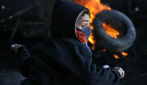 12月28日,在耶路撒冷的一個難民營,一名巴勒斯坦男孩向以色列士兵投擲石子,以表達對以色列空襲的抗議。以色列當日繼續(xù)對加沙地帶進行空襲,空襲已造成上千人傷亡。