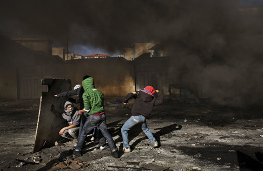 一群巴勒斯坦少年向以色列士兵投擲石子,以表達(dá)憤怒。