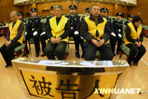 12月29日,三鹿問題奶粉系列刑事案件被告人高俊杰、薛建忠、張彥軍、肖玉(從左至右)在石家莊市中級人民法院法庭上受審。新華社發(fā) 丁立新 攝