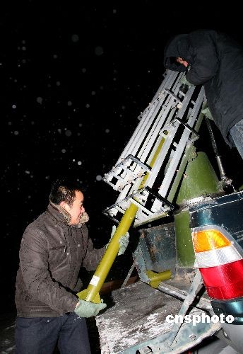 12月26日,新疆哈密人工增雪工作人員準(zhǔn)備發(fā)射人工增雪火箭彈。